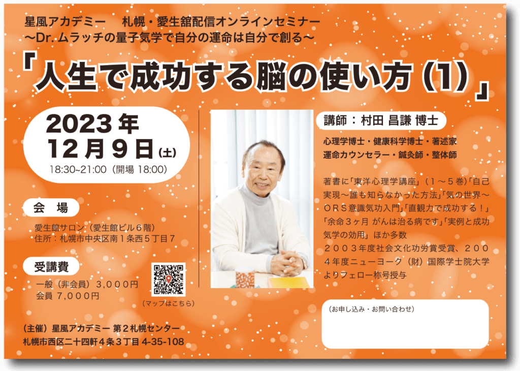 村田昌謙博士より、2023年12月9日(土)に一般(非会員)対象セミナー「人生で成功する脳の使い方(1)」を開催して頂けることになりました。