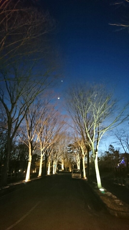 青白い空に、輝く三日月に寄り添うのは、金星か木星か。天体は、黙々とブルーの光を地上に降り注いでいる。