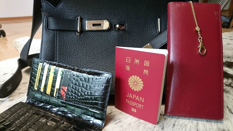 お気に入りの黒のクロコダイルの長財布。もうひとつのカード入れと、8枚のカード。さらに、携帯のカバーがあった。