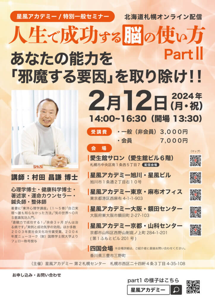 村田昌謙博士より、2023年12月9日(土)に一般(非会員)対象セミナー「人生で成功する脳の使い方(1)」を開催していただきました。